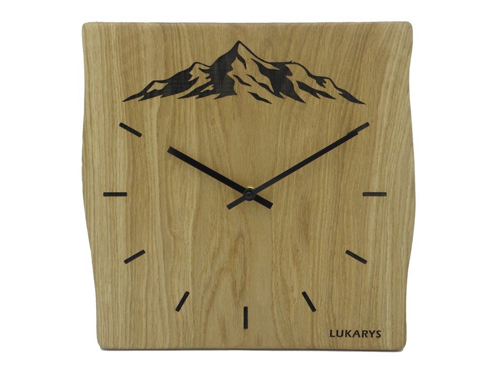 Dubové hodiny LUKARYS – motiv hor, tichý chod, ruční výroba